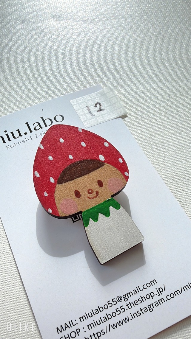 商品説明 こちらは miu.laboオリジナルの 木製ブローチ です。 いちごをモチーフにしたこけしのブローチで 一つひとつ、表情を手描きで仕上げています。 同じデザインでも少しずつ表情が違うのが このブローチの特徴です。 ぜひ お好きなお顔の子を選んでくださいね。 ⸻ サイズについて 大きさは 縦 約5cm × 横 約3cm です。 ※手作業で制作しているため木のカットや描き方により数ミリ程度の個体差が生じる場合があります。あらかじめご了承ください。 ⸻ ご購入前に ・一点一点、手描きで制作しています ・強い衝撃や水濡れにはご注意ください ・木製品のため、木目の出方には個体差があります 手仕事ならではの風合いとして 楽しんでいただけたら嬉しいです。